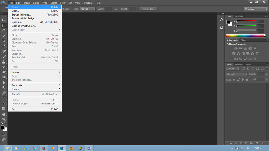 خب برای ایجاد یک سَنَد یا به بان عامیانه فایل جدید از منوی File گزینه New رو انتخاب میکنیم یا از کلید های Ctrl + N استفاده میکنیم . ( مانند تصویر زیر )