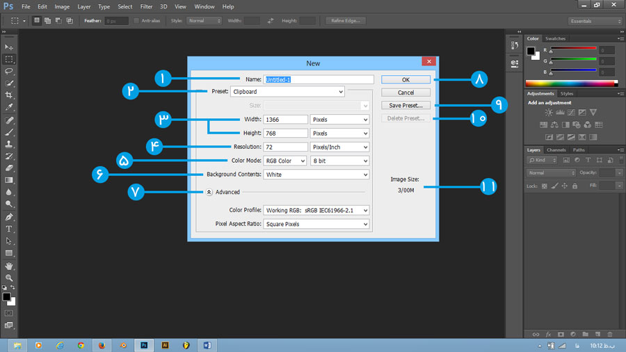 بعد از کلیک کردن روی گزینه New با کادر مستطیلی زیر روبرو میشیم که شامل تنظیمات ایجاد یک فایل جدیده و من اونو به شما توضیح میدم