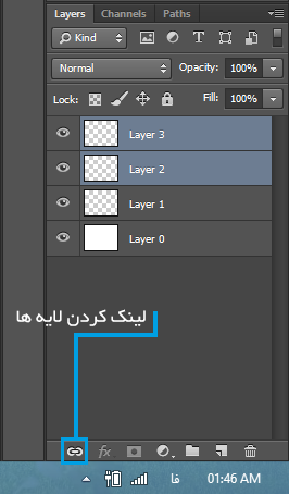 روش لینک کردن هم مثل گروه کردن اینطوریه که چند لایه مورد نظر رو انتخاب میکنیم و طبق تصویر زیر روی آیکون مورد نظر کلیک میکنیم .
